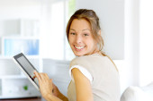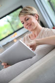 Piękna kobieta w domu połączony z cyfrowego tabletu