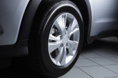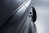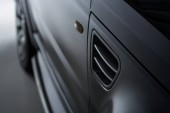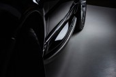 Zobacz luksusowe błyszczący czarny samochód na ciemnym tle z bliska