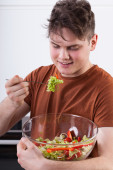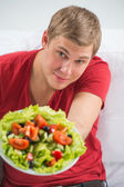 młody przystojny mężczyzna przygotowuje się do jedzenia świeże zdrowe sałatki