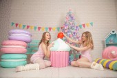 Ładniutka, śmiejąc się szczupła dziewczyna w koszula i jeansy z jej ulubionych ogromne różowe lody w wafel Cup i cieszyć się życiem na tle białym choinką, prezentami