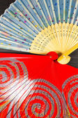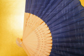 Widok z góry wentylatora z hieroglifów i chińskie ozdoby na drewnianym stole
