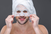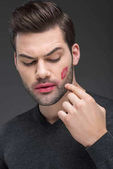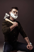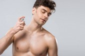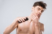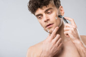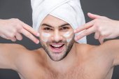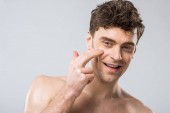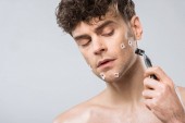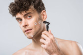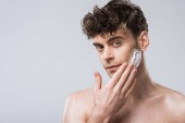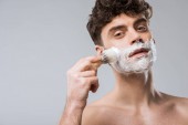 przystojny macho stosowanie pianki do golenia twarzy, na szarym tle