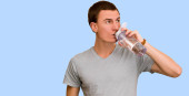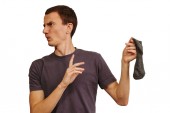 Facet trzyma brudnych skarpetek. Emocje z obrzydzeniem od zapachu. Mężczyzna na białym tle