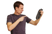 Facet zacisnął dłonie w pięści. Emocja furia. Mężczyzna na białym tle