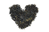Da Hong Pao Herbata oolong, w kształcie serca, zbliżenie, na białym tle. Herbata oolong chiński duża czerwona szata używana jako napój energetyczny i dla utraty wagi.