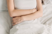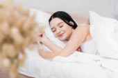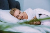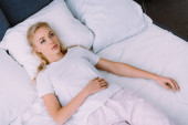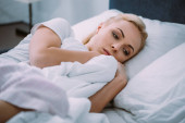 zdenerwowana kobieta trzymając koc w łóżku w domu i szukasz drogi