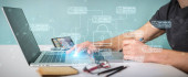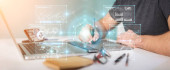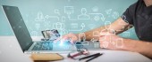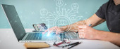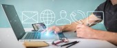 Zdjęcie "Biznesmen na niewyraźne tło za pomocą cienkiej linii kontaktu ikony" może być wykorzystywane do celów osobistych i komercyjnych zgodnie z warunkami zakupionej licencji Royalty-free. Obraz jest dostępny do pobrania w jakości wysokiej rozdzielczości do 5760x3840.