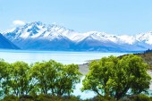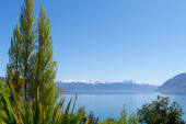 Lake Hawea, rozległy widok z brzegu tp ośnieżone góry w odległości z liści drzewa kapusta kadrowania obrazu po stronie