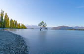 Lake Wanaka od Glendhu Bay pięknie uspokoić odbijającej wiosna kolor liści i Alpy Południowe jako tło