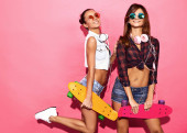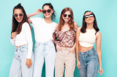 Zdjęcie "Trzech młodych na stylowy uśmiechający się piękne dziewczyny z kolorowe plecaka. Kobieta w lato hipster checkered koszula Odzież pozowanie w pobliżu niebieską ścianą w studio. Pozytywne modele zabawy i wariuje" może być wykorzystywane do celów osobistych i komercyjnych zgodnie z warunkami zakupionej licencji Royalty-free. Obraz jest dostępny do pobrania w jakości wysokiej rozdzielczości do 5760x3840.