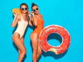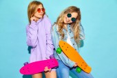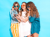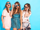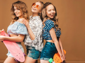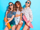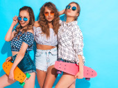 Trzech młodych na stylowy uśmiechający się piękne dziewczyny z kolorowe plecaka. Kobieta w lato hipster checkered koszula Odzież pozowanie w pobliżu niebieską ścianą w studio. Pozytywne modele zabawy i wariuje