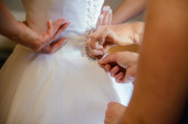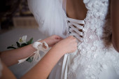 Rano przygotowania panny młodej. Kobiet w ręce zawiązać wstążki na sukni ślubnej.