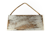 Puste białe rustykalne myte trudnej sytuacji szyld drewniany z liny wieszak na białym tle.