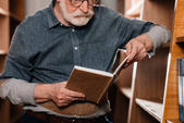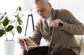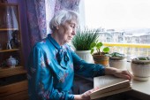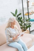 przycięte widzenia starszy Kobieta, patrząc na obraz ramki w domu z miejsca kopii