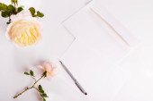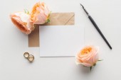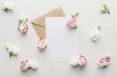 Widok z góry eustoma, koperta z pustą kartę i pióra na szarym tle