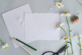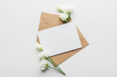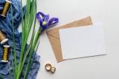 Widok z góry eustoma, tkaniny, koperta z puste karty i atramentem pióra na szarym tle