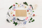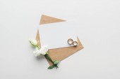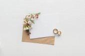 Widok z góry puste puste koperty brązowe i kwiaty na szarym tle