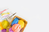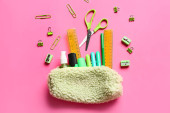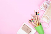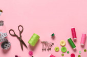 Kolorowe nici z akcesoriami do szycia na różowym tle