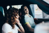Selektywny fokus wesoły kręcone kobieta stoi w pobliżu samochodów