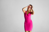 piękne stylowe młoda kobieta w Burgundii ubrania siedzi w fotelu i pozowanie na szary z kopią przestrzeni