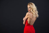 piękny stylowy młoda kobieta w Burgundii ubrania patrząc na kamerę i stwarzające z fotela na szarym