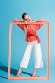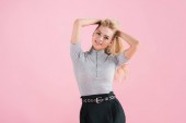 zaskoczony stylowa dziewczyna w okularach słonecznych i talii torba dotykając włosów na NK