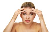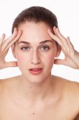 atrakcyjny brunetka dama dotykając czoło na białym tle