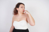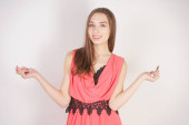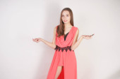 uroczy młody kaukaski dziewczyna w strój wieczorowy stoi bez makijażu i posiada otwartą różową szminkę na białym tle w Studio