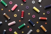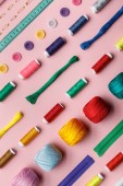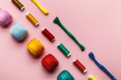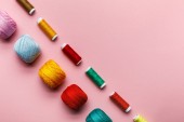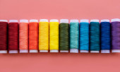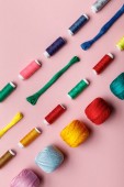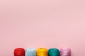 Widok z góry kolorowych zwojów nici w rzędzie na różowym