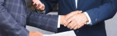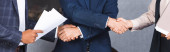 panoramiczny strzał wielokulturowych biznesmenów drżenie rąk w pobliżu współpracowników w biurze
