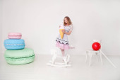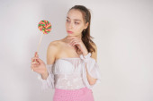 cute kobiece kaukaski dziewczyna stoi w przezroczystej, cienkiej letniej koszulce z okrągłym kolorowym cukierków w ręku na białym tle w Studio