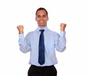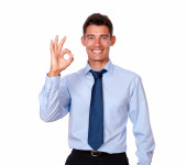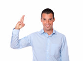 uroczy człowiek uśmiechający się i pokazując znak zwycięstwo