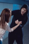 Widok z boku kary karnego w casual ubrania trzymając nóż na czarnym