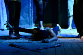 częściowy widok badacza obejmującego martwego człowieka na scenie zbrodni
