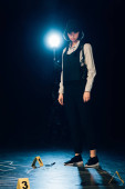 pełny widok długości detektywa stojący w pobliżu konturu kredą na scenie zbrodni