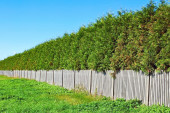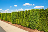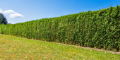 Długi zielony żywopłoty z trawnikiem i niebieskim tle nieba.