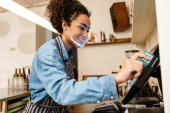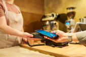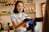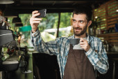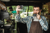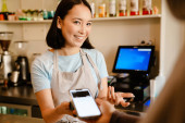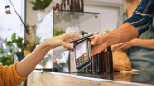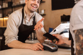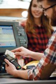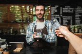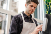 Portret kaukaski człowiek, który trzyma Terminal konsumencki