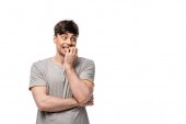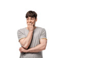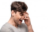 szczęśliwy młody człowiek pokazując triumf gest i krzyczeć na białym tle