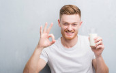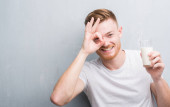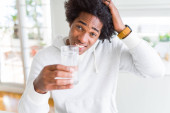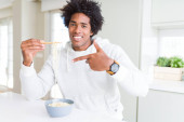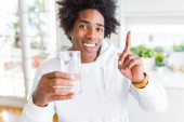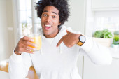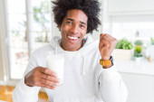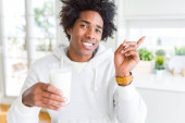 African American mężczyzna trzyma i picie szkła mleka bardzo szczęśliwy wskazując ręką i palcem