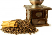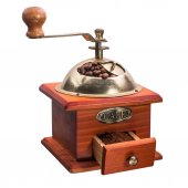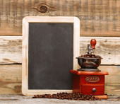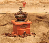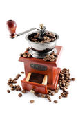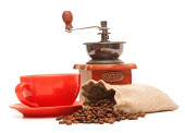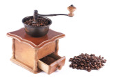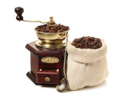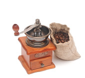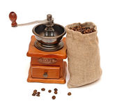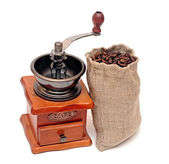 kawa w brązową torebkę i Starego rocznika drewniane Młynki do kawy isolat