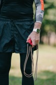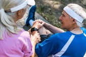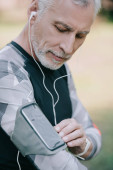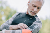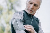 przystojny dojrzały sportowca patrząc na fitness śledzone podczas słuchania muzyki w słuchawkach