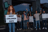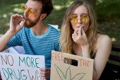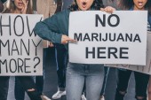przycięte widok kobiety trzyma afisz z nie marihuany napis w pobliżu krzyczeć ludzi wielokulturowych