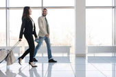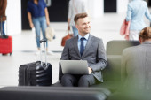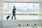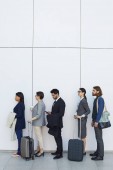 Bezpośrednio nad widokiem biznesmenów w garniturach posiadających uchwyty kołowe walizki i omawianie podróży służbowej na lotnisku