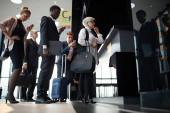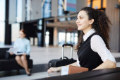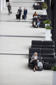 Zdjęcie "Bezpośrednio nad widokiem biznesmenów w garniturach posiadających uchwyty kołowe walizki i omawianie podróży służbowej na lotnisku" może być wykorzystywane do celów osobistych i komercyjnych zgodnie z warunkami zakupionej licencji Royalty-free. Obraz jest dostępny do pobrania w jakości wysokiej rozdzielczości do 5760x3840.