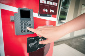 Kobieta interesu wtihdrawing pieniądze z bankomatu bankowego dla transakcji