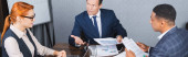częściowy widok wieloetnicznych biznesmenów przy stole podczas konferencji w biurze