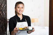 Zbliżenie młodej kelnerki w jednolitej tacce ze śniadaniem i sokiem i uśmiechniętymi stojąc w pokoju hotelowym