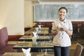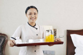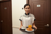 Zdjęcie "Zbliżenie młodej kelnerki w jednolitej tacce ze śniadaniem i sokiem i uśmiechniętymi stojąc w pokoju hotelowym" może być wykorzystywane do celów osobistych i komercyjnych zgodnie z warunkami zakupionej licencji Royalty-free. Obraz jest dostępny do pobrania w jakości wysokiej rozdzielczości do 5760x3840.