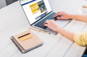 Kijów, Ukraina-8 lipca 2019: selektywne skupienie człowieka trzymając tablet cyfrowy z aplikacji rezerwacji na ekranie w pobliżu laptopa w biurze