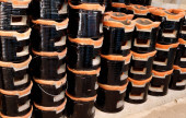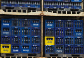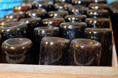 czarne butelki na wino na paletach w przestrzeni zewnętrznej